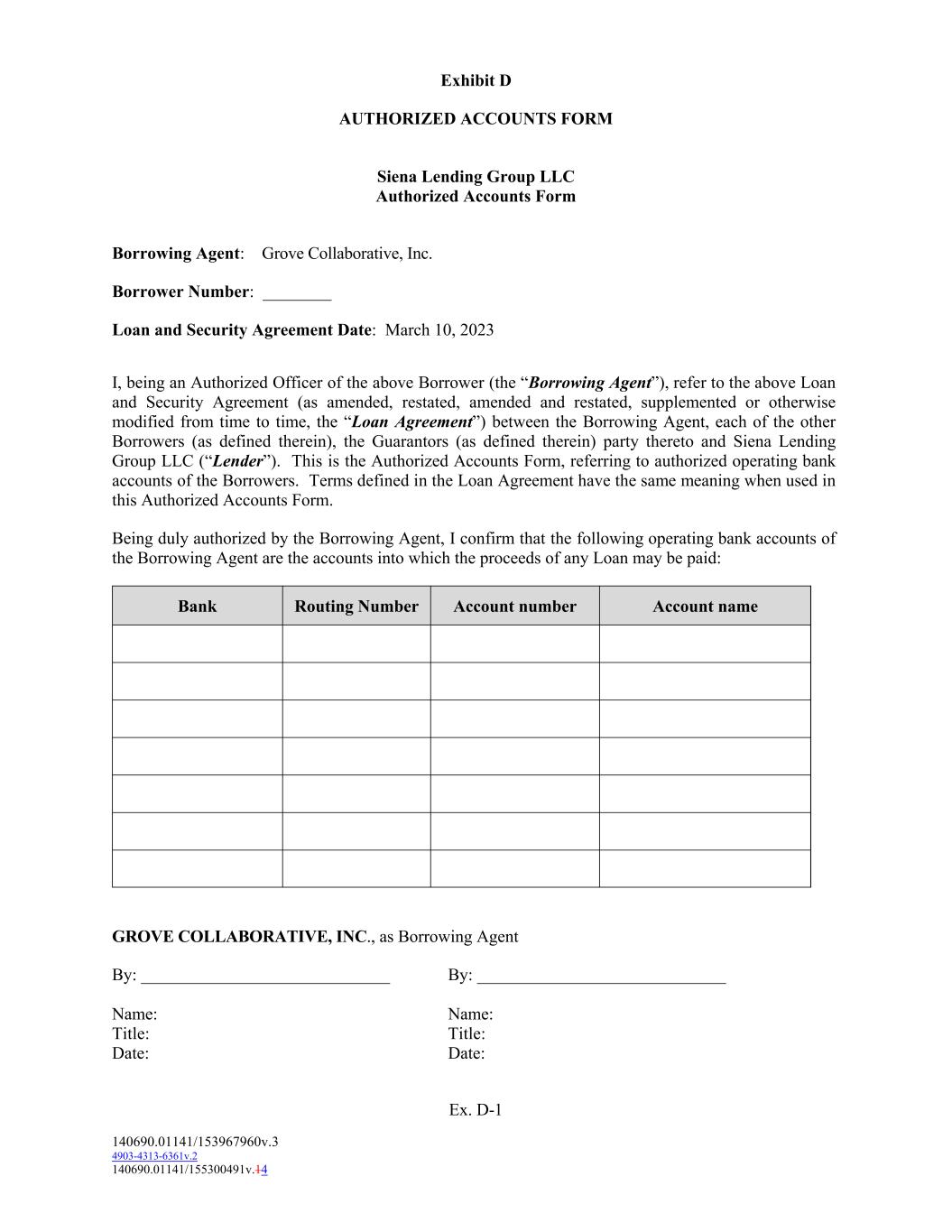 Ex. D-1 140690.01141/153967960v.3 4903-4313-6361v.2 140690.01141/155300491v.14 Exhibit D AUTHORIZED ACCOUNTS FORM Siena Lending Group LLC Authorized Accounts Form Borrowing Agent: Grove Collaborative, Inc. Borrower Number: ________ Loan and Security Agreement Date: March 10, 2023 I, being an Authorized Officer of the above Borrower (the “Borrowing Agent”), refer to the above Loan and Security Agreement (as amended, restated, amended and restated, supplemented or otherwise modified from time to time, the “Loan Agreement”) between the Borrowing Agent, each of the other Borrowers (as defined therein), the Guarantors (as defined therein) party thereto and Siena Lending Group LLC (“Lender”). This is the Authorized Accounts Form, referring to authorized operating bank accounts of the Borrowers. Terms defined in the Loan Agreement have the same meaning when used in this Authorized Accounts Form. Being duly authorized by the Borrowing Agent, I confirm that the following operating bank accounts of the Borrowing Agent are the accounts into which the proceeds of any Loan may be paid: Account number Account nameBank GROVE COLLABORATIVE, INC., as Borrowing Agent By: _____________________________ By: _____________________________ Name: Name: Title: Title: Date: Date: Routing Number