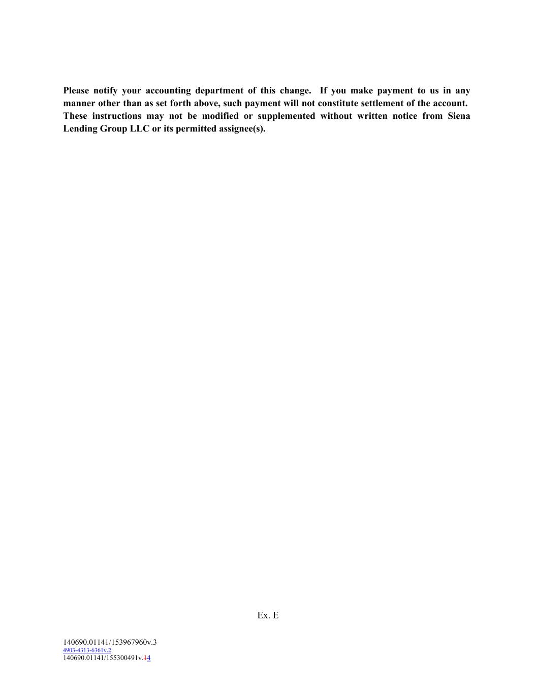 Please notify your accounting department of this change. If you make payment to us in any manner other than as set forth above, such payment will not constitute settlement of the account. These instructions may not be modified or supplemented without written notice from Siena Lending Group LLC or its permitted assignee(s). Ex. E 140690.01141/153967960v.3 4903-4313-6361v.2 140690.01141/155300491v.14