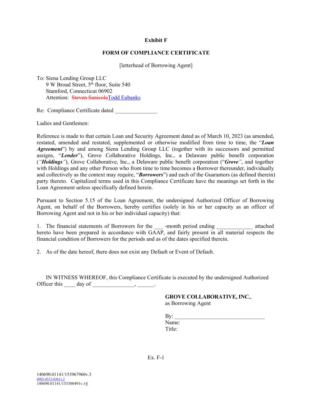 Exhibit F FORM OF COMPLIANCE CERTIFICATE [letterhead of Borrowing Agent] To: Siena Lending Group LLC 9 W Broad Street, 5th floor, Suite 540 Stamford, Connecticut 06902 Attention: Steven SanicolaTodd Eubanks Re: Compliance Certificate dated _______________ Ladies and Gentlemen: Reference is made to that certain Loan and Security Agreement dated as of March 10, 2023 (as amended, restated, amended and restated, supplemented or otherwise modified from time to time, the “Loan Agreement”) by and among Siena Lending Group LLC (together with its successors and permitted assigns, “Lender”), Grove Collaborative Holdings, Inc., a Delaware public benefit corporation (“Holdings”), Grove Collaborative, Inc., a Delaware public benefit corporation (“Grove”, and together with Holdings and any other Person who from time to time becomes a Borrower thereunder, individually and collectively as the context may require, “Borrowers”) and each of the Guarantors (as defined therein) party thereto. Capitalized terms used in this Compliance Certificate have the meanings set forth in the Loan Agreement unless specifically defined herein. Pursuant to Section 5.15 of the Loan Agreement, the undersigned Authorized Officer of Borrowing Agent, on behalf of the Borrowers, hereby certifies (solely in his or her capacity as an officer of Borrowing Agent and not in his or her individual capacity) that: 1. The financial statements of Borrowers for the ___ -month period ending _____________ attached hereto have been prepared in accordance with GAAP, and fairly present in all material respects the financial condition of Borrowers for the periods and as of the dates specified therein. 2. As of the date hereof, there does not exist any Default or Event of Default. IN WITNESS WHEREOF, this Compliance Certificate is executed by the undersigned Authorized Officer this ____ day of _______________, ______. GROVE COLLABORATIVE, INC., as Borrowing Agent By: ________________________________ Name: Title: Ex. F-1 140690.01141/153967960v.3 4903-4313-6361v.2 140690.01141/155300491v.14