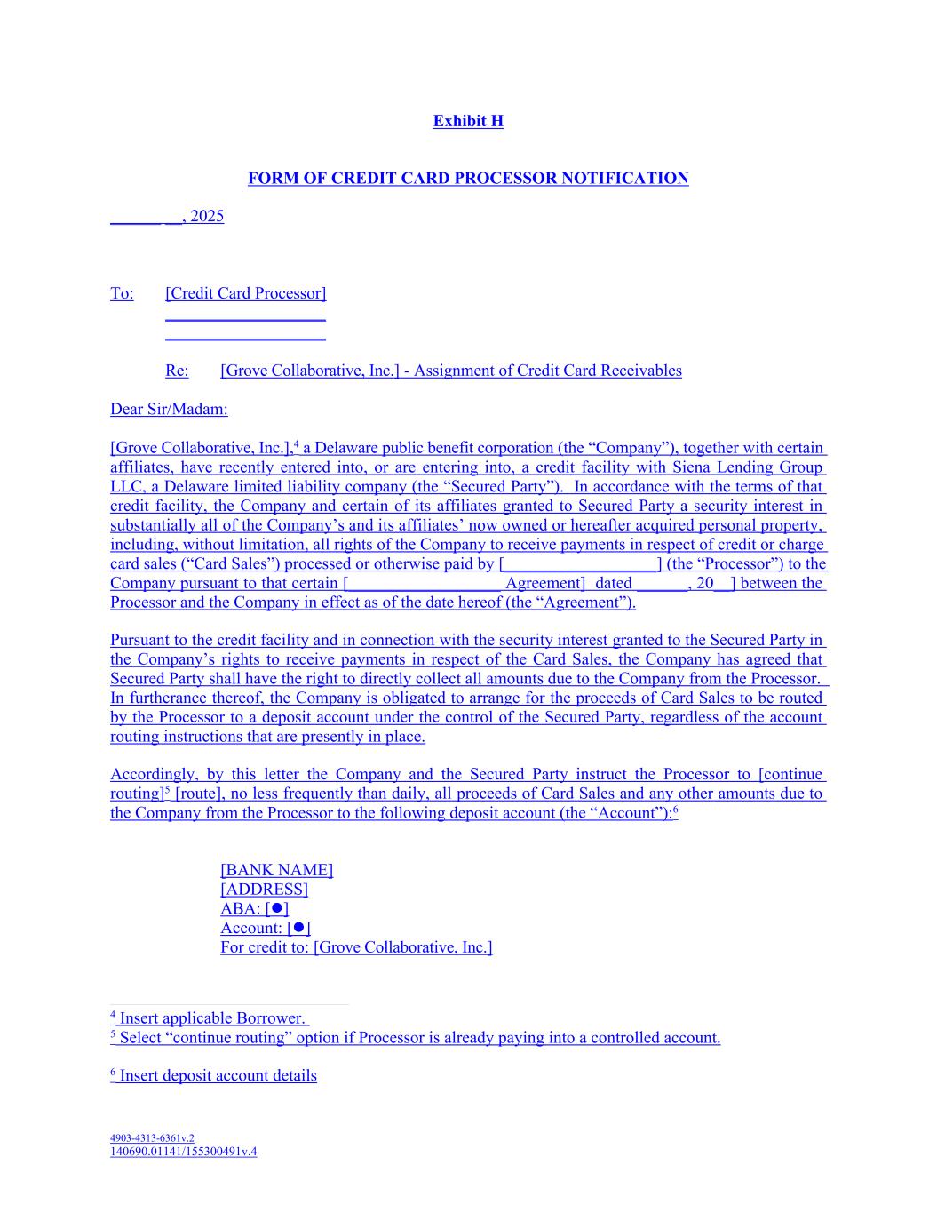 4903-4313-6361v.2 140690.01141/155300491v.4 Accordingly, by this letter the Company and the Secured Party instruct the Processor to [continue routing]5 [route], no less frequently than daily, all proceeds of Card Sales and any other amounts due to the Company from the Processor to the following deposit account (the “Account”):6 [BANK NAME] [ADDRESS] ABA: [] Account: [] For credit to: [Grove Collaborative, Inc.] Exhibit H FORM OF CREDIT CARD PROCESSOR NOTIFICATION ______ __, 2025 To: [Credit Card Processor] ___________________ ___________________ Re: [Grove Collaborative, Inc.] - Assignment of Credit Card Receivables Dear Sir/Madam: [Grove Collaborative, Inc.],4 a Delaware public benefit corporation (the “Company”), together with certain affiliates, have recently entered into, or are entering into, a credit facility with Siena Lending Group LLC, a Delaware limited liability company (the “Secured Party”). In accordance with the terms of that credit facility, the Company and certain of its affiliates granted to Secured Party a security interest in substantially all of the Company’s and its affiliates’ now owned or hereafter acquired personal property, including, without limitation, all rights of the Company to receive payments in respect of credit or charge card sales (“Card Sales”) processed or otherwise paid by [__________________] (the “Processor”) to the Company pursuant to that certain [__________________ Agreement] dated ______, 20__] between the Processor and the Company in effect as of the date hereof (the “Agreement”). Pursuant to the credit facility and in connection with the security interest granted to the Secured Party in the Company’s rights to receive payments in respect of the Card Sales, the Company has agreed that Secured Party shall have the right to directly collect all amounts due to the Company from the Processor. In furtherance thereof, the Company is obligated to arrange for the proceeds of Card Sales to be routed by the Processor to a deposit account under the control of the Secured Party, regardless of the account routing instructions that are presently in place. 4 Insert applicable Borrower. 5 Select “continue routing” option if Processor is already paying into a controlled account. 6 Insert deposit account details