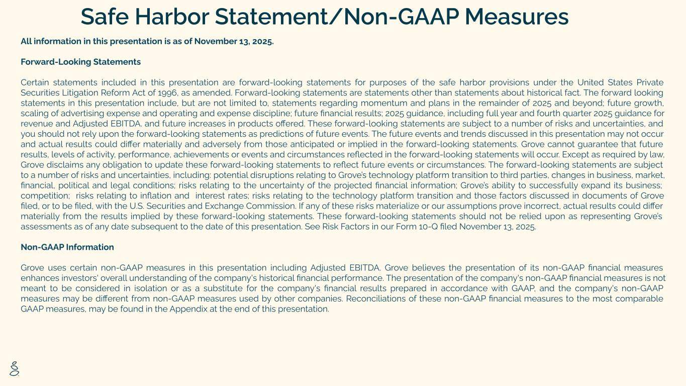 All information in this presentation is as of November 13, 2025. Forward-Looking Statements Certain statements included in this presentation are forward-looking statements for purposes of the safe harbor provisions under the United States Private Securities Litigation Reform Act of 1996, as amended. Forward-looking statements are statements other than statements about historical fact. The forward looking statements in this presentation include, but are not limited to, statements regarding momentum and plans in the remainder of 2025 and beyond; future growth, scaling of advertising expense and operating and expense discipline; future financial results; 2025 guidance, including full year and fourth quarter 2025 guidance for revenue and Adjusted EBITDA. and future increases in products offered. These forward-looking statements are subject to a number of risks and uncertainties, and you should not rely upon the forward-looking statements as predictions of future events. The future events and trends discussed in this presentation may not occur and actual results could differ materially and adversely from those anticipated or implied in the forward-looking statements. Grove cannot guarantee that future results, levels of activity, performance, achievements or events and circumstances reflected in the forward-looking statements will occur. Except as required by law, Grove disclaims any obligation to update these forward-looking statements to reflect future events or circumstances. The forward-looking statements are subject to a number of risks and uncertainties, including: potential disruptions relating to Grove’s technology platform transition to third parties, changes in business, market, financial, political and legal conditions; risks relating to the uncertainty of the projected financial information; Grove’s ability to successfully expand its business; competition; risks relating to inflation and interest rates; risks relating to the technology platform transition and those factors discussed in documents of Grove filed, or to be filed, with the U.S. Securities and Exchange Commission. If any of these risks materialize or our assumptions prove incorrect, actual results could differ materially from the results implied by these forward-looking statements. These forward-looking statements should not be relied upon as representing Grove’s assessments as of any date subsequent to the date of this presentation. See Risk Factors in our Form 10-Q filed November 13, 2025. Non-GAAP Information Grove uses certain non-GAAP measures in this presentation including Adjusted EBITDA. Grove believes the presentation of its non-GAAP financial measures enhances investors' overall understanding of the company's historical financial performance. The presentation of the company's non-GAAP financial measures is not meant to be considered in isolation or as a substitute for the company's financial results prepared in accordance with GAAP, and the company's non-GAAP measures may be different from non-GAAP measures used by other companies. Reconciliations of these non-GAAP financial measures to the most comparable GAAP measures, may be found in the Appendix at the end of this presentation. Safe Harbor Statement/Non-GAAP Measures
