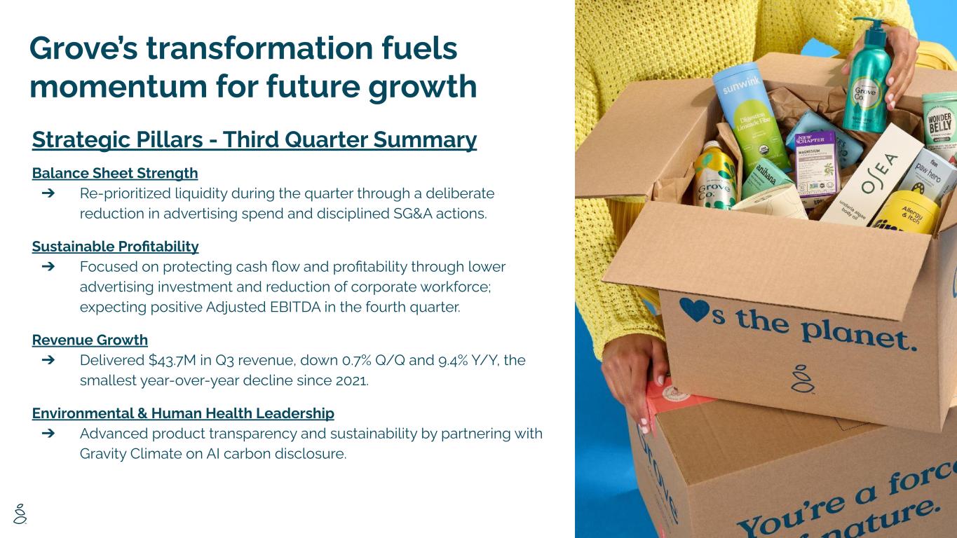 Grove’s transformation fuels momentum for future growth Strategic Pillars - Third Quarter Summary Balance Sheet Strength ➔ Re-prioritized liquidity during the quarter through a deliberate reduction in advertising spend and disciplined SG&A actions. Sustainable Profitability ➔ Focused on protecting cash flow and profitability through lower advertising investment and reduction of corporate workforce; expecting positive Adjusted EBITDA in the fourth quarter. Revenue Growth ➔ Delivered $43.7M in Q3 revenue, down 0.7% Q/Q and 9.4% Y/Y, the smallest year-over-year decline since 2021. Environmental & Human Health Leadership ➔ Advanced product transparency and sustainability by partnering with Gravity Climate on AI carbon disclosure.