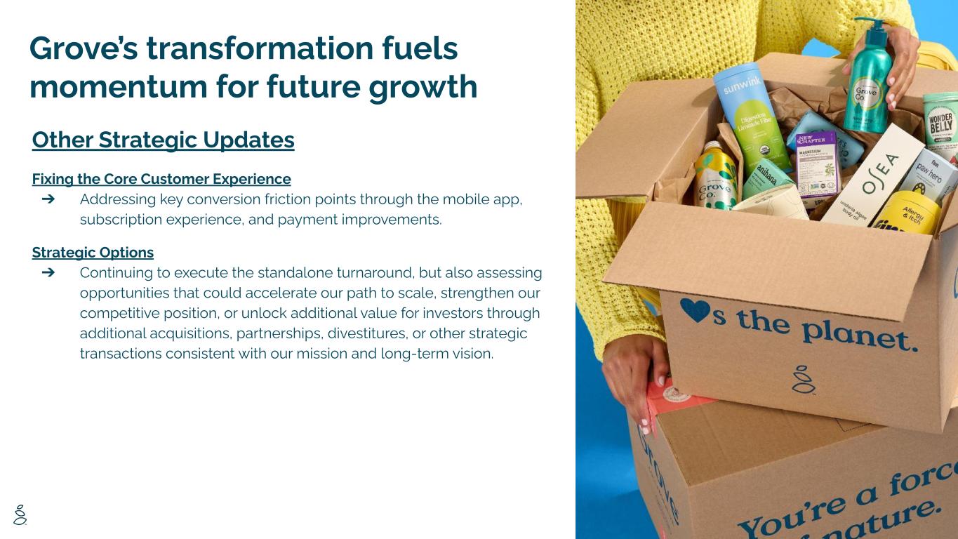 Grove’s transformation fuels momentum for future growth Other Strategic Updates Fixing the Core Customer Experience ➔ Addressing key conversion friction points through the mobile app, subscription experience, and payment improvements. Strategic Options ➔ Continuing to execute the standalone turnaround, but also assessing opportunities that could accelerate our path to scale, strengthen our competitive position, or unlock additional value for investors through additional acquisitions, partnerships, divestitures, or other strategic transactions consistent with our mission and long-term vision.
