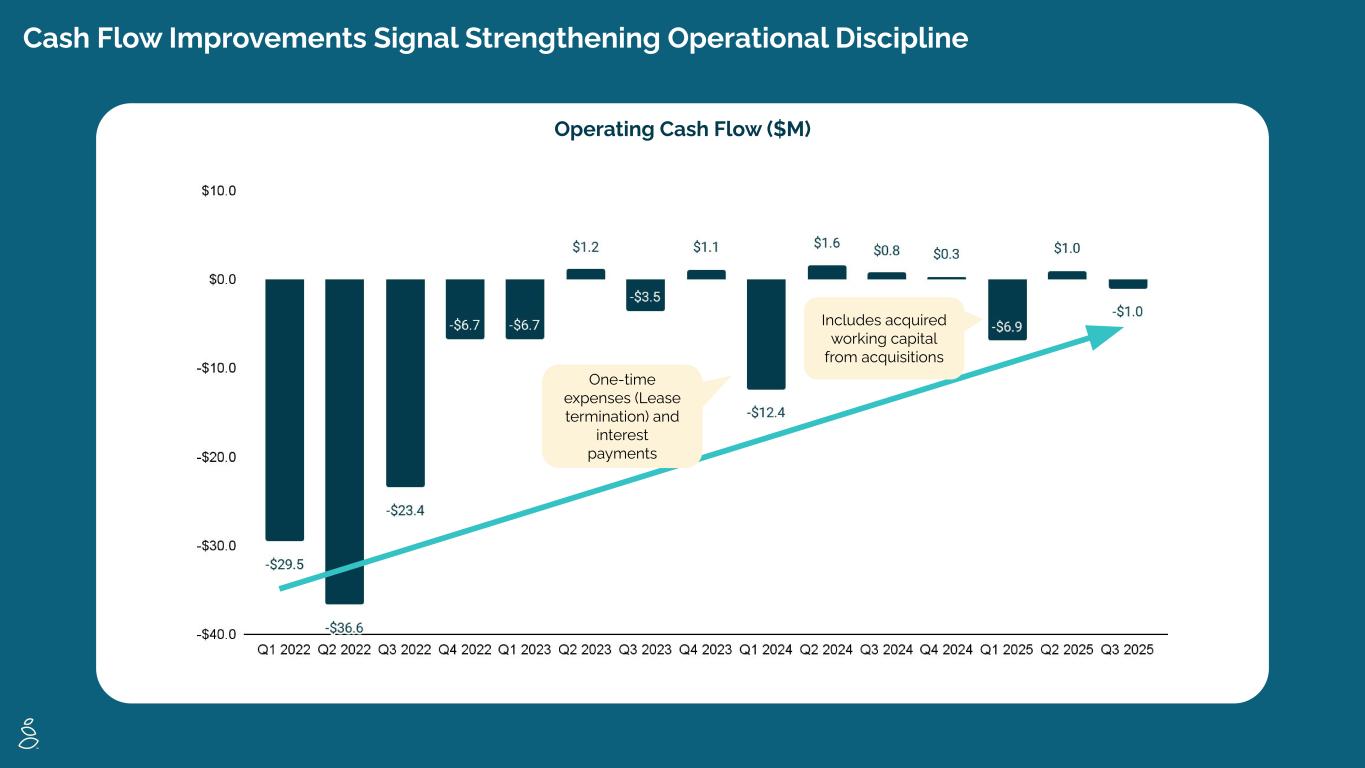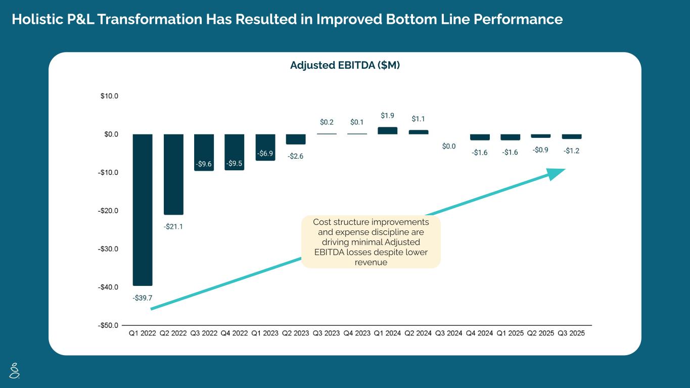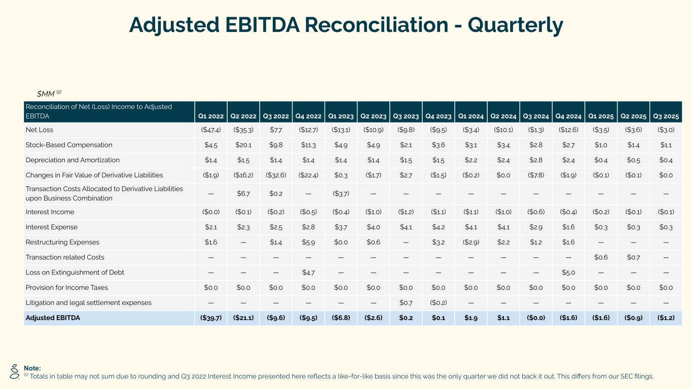 Adjusted EBITDA Reconciliation - Quarterly $MM (1) Note: (1) Totals in table may not sum due to rounding and Q3 2022 Interest Income presented here reflects a like-for-like basis since this was the only quarter we did not back it out. This differs from our SEC filings. Reconciliation of Net (Loss) Income to Adjusted EBITDA Q1 2022 Q2 2022 Q3 2022 Q4 2022 Q1 2023 Q2 2023 Q3 2023 Q4 2023 Q1 2024 Q2 2024 Q3 2024 Q4 2024 Q1 2025 Q2 2025 Q3 2025 Net Loss ($47.4) ($35.3) $7.7 ($12.7) ($13.1) ($10.9) ($9.8) ($9.5) ($3.4) ($10.1) ($1.3) ($12.6) ($3.5) ($3.6) ($3.0) Stock-Based Compensation $4.5 $20.1 $9.8 $11.3 $4.9 $4.9 $2.1 $3.6 $3.1 $3.4 $2.8 $2.7 $1.0 $1.4 $1.1 Depreciation and Amortization $1.4 $1.5 $1.4 $1.4 $1.4 $1.4 $1.5 $1.5 $2.2 $2.4 $2.8 $2.4 $0.4 $0.5 $0.4 Changes in Fair Value of Derivative Liabilities ($1.9) ($16.2) ($32.6) ($22.4) $0.3 ($1.7) $2.7 ($1.5) ($0.2) $0.0 ($7.8) ($1.9) ($0.1) ($0.1) $0.0 Transaction Costs Allocated to Derivative Liabilities upon Business Combination — $6.7 $0.2 — ($3.7) — — — — — — — — — — Interest Income ($0.0) ($0.1) ($0.2) ($0.5) ($0.4) ($1.0) ($1.2) ($1.1) ($1.1) ($1.0) ($0.6) ($0.4) ($0.2) ($0.1) ($0.1) Interest Expense $2.1 $2.3 $2.5 $2.8 $3.7 $4.0 $4.1 $4.2 $4.1 $4.1 $2.9 $1.6 $0.3 $0.3 $0.3 Restructuring Expenses $1.6 — $1.4 $5.9 $0.0 $0.6 — $3.2 ($2.9) $2.2 $1.2 $1.6 — — — Transaction related Costs — — — — — — — — — — — — $0.6 $0.7 — Loss on Extinguishment of Debt — — — $4.7 — — — — — — — $5.0 — — — Provision for Income Taxes $0.0 $0.0 $0.0 $0.0 $0.0 $0.0 $0.0 $0.0 $0.0 $0.0 $0.0 $0.0 $0.0 $0.0 $0.0 Litigation and legal settlement expenses — — — — — — $0.7 ($0.2) — — — — — — — Adjusted EBITDA ($39.7) ($21.1) ($9.6) ($9.5) ($6.8) ($2.6) $0.2 $0.1 $1.9 $1.1 ($0.0) ($1.6) ($1.6) ($0.9) ($1.2)