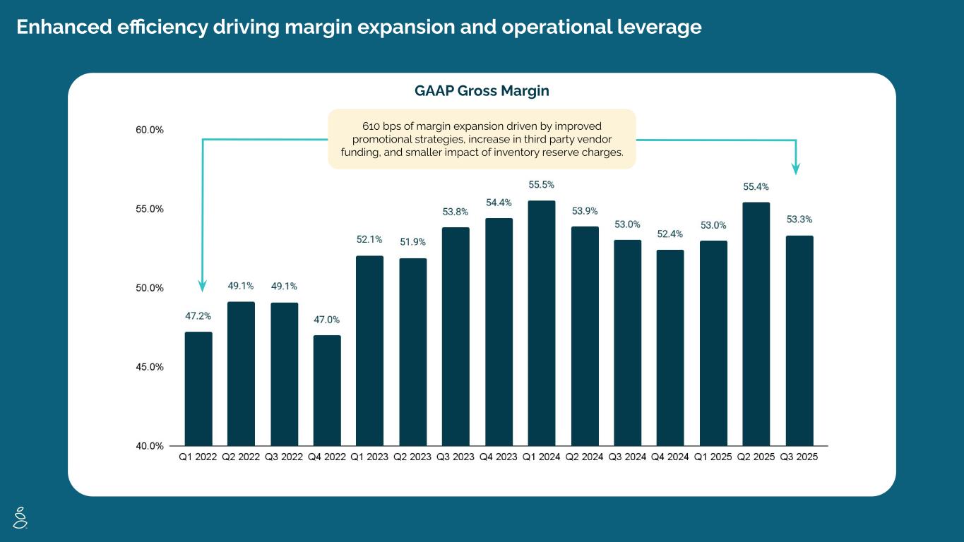 Enhanced efficiency driving margin expansion and operational leverage GAAP Gross Margin 610 bps of margin expansion driven by improved promotional strategies, increase in third party vendor funding, and smaller impact of inventory reserve charges.