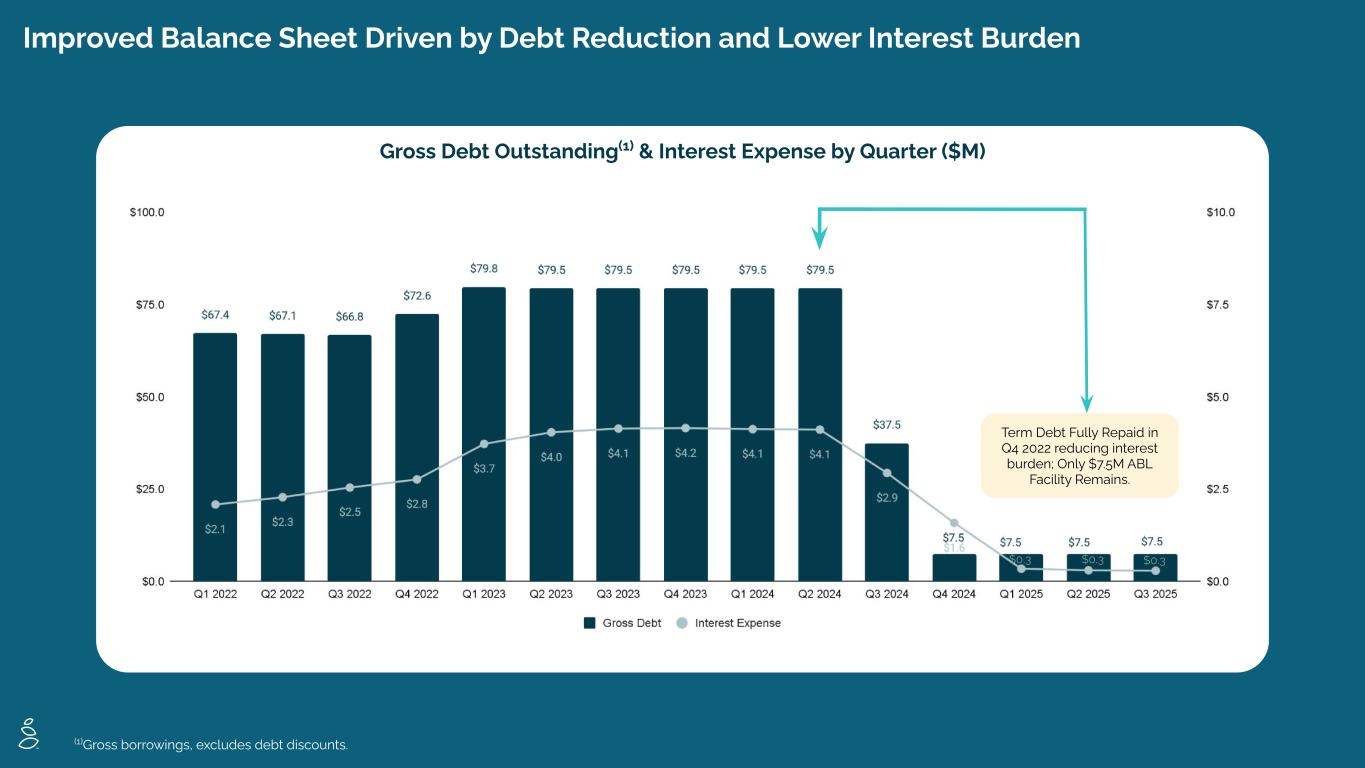 Improved Balance Sheet Driven by Debt Reduction and Lower Interest Burden Gross Debt Outstanding(1) & Interest Expense by Quarter ($M) Interest Expense Down 90% in 2025 vs. 2024 — Freeing Up Capital (1)Gross borrowings, excludes debt discounts. Term Debt Fully Repaid in Q4 2022 reducing interest burden; Only $7.5M ABL Facility Remains. $0.3 $0.3 $0.3