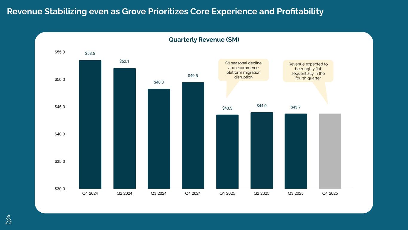 Revenue Stabilizing even as Grove Prioritizes Core Experience and Profitability Quarterly Revenue ($M) Q1 seasonal decline and ecommerce platform migration disruption Revenue expected to be roughly flat sequentially in the fourth quarter