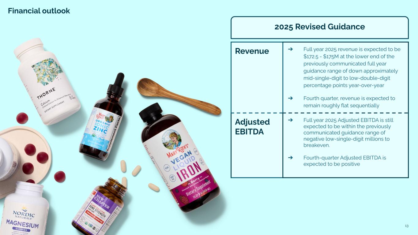 Q3 2025 Financial Results ADJUSTED EBITDA GROSS MARGIN REVENUE $43.7M -9.4% vs. LY -0.7% vs. Q2 25 53.3% +30 bps vs. LY -$1.2M, (2.7)% LY Breakeven -$1.0M LY +$0.8M Revenue performance marks our smallest year-over-year decline since Q4 of 2021. The decline versus last year primarily reflects the effects of reduced advertising investment in prior periods, which led to a smaller active subscriber base entering 2025, as well as the friction from our eCommerce migration that began earlier this year. Sequentially, fewer orders were partially offset by higher net revenue per order. Gross Margin improvement reflects more targeted and improved promotional strategies resulting in lower discounts, partially offset by a more favorable product mix. Adjusted EBITDA includes the flow through of lower revenue offset by cost structure improvements. Operating Cash Flow driven by quarterly net loss, net of non-cash expenses offset by a decrease in working capital. OPERATING CASH FLOW