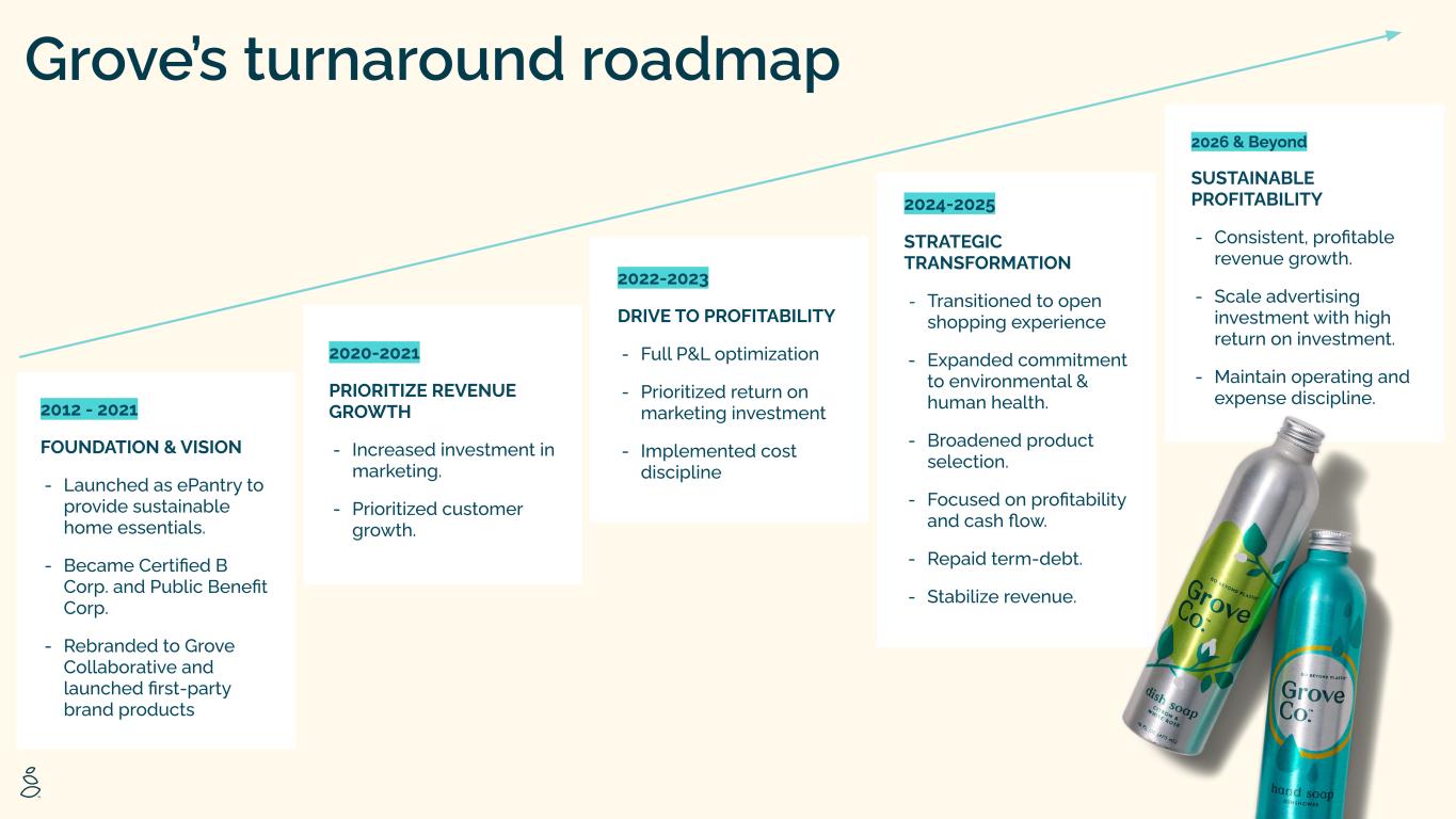 2020-2021 PRIORITIZE REVENUE GROWTH - Increased investment in marketing. - Prioritized customer growth. 2022-2023 DRIVE TO PROFITABILITY - Full P&L optimization - Prioritized return on marketing investment - Implemented cost discipline 2024-2025 STRATEGIC TRANSFORMATION - Transitioned to open shopping experience - Expanded commitment to environmental & human health. - Broadened product selection. - Focused on profitability and cash flow. - Repaid term-debt. - Stabilize revenue. 2026 & Beyond SUSTAINABLE PROFITABILITY - Consistent, profitable revenue growth. - Scale advertising investment with high return on investment. - Maintain operating and expense discipline.2012 - 2021 FOUNDATION & VISION - Launched as ePantry to provide sustainable home essentials. - Became Certified B Corp. and Public Benefit Corp. - Rebranded to Grove Collaborative and launched first-party brand products Grove’s turnaround roadmap