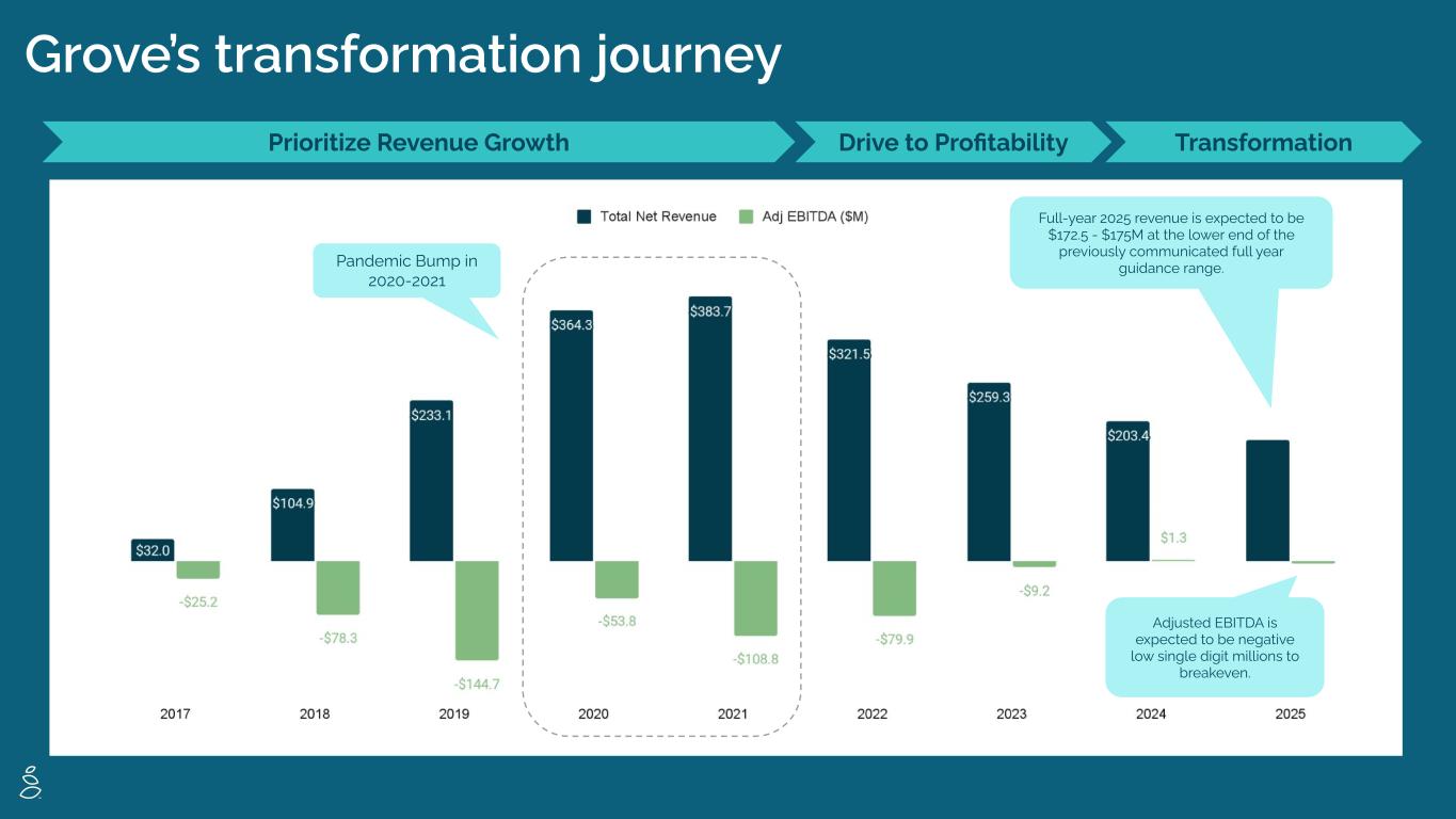 Grove’s transformation journey Prioritize Revenue Growth Drive to Profitability Transformation Pandemic Bump in 2020-2021 Full-year 2025 revenue is expected to be $172.5 - $175M at the lower end of the previously communicated full year guidance range. Adjusted EBITDA is expected to be negative low single digit millions to breakeven.