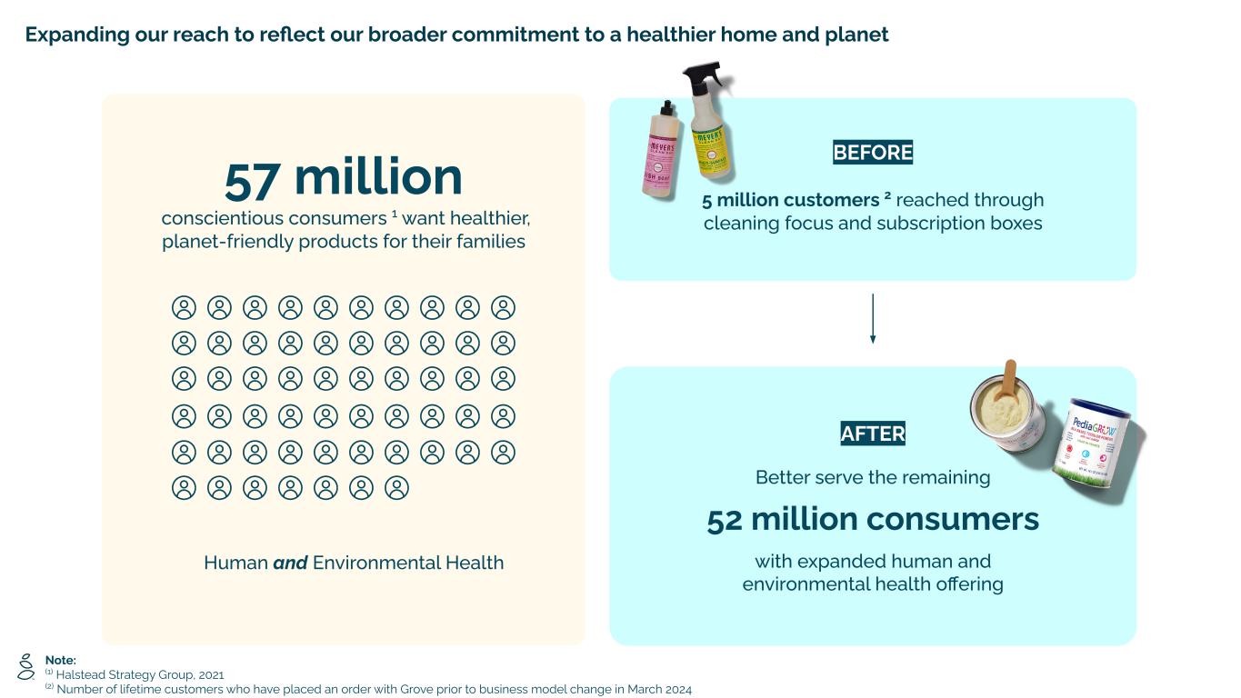 Expanding our reach to reflect our broader commitment to a healthier home and planet Human and Environmental Health BEFORE 5 million customers 2 reached through cleaning focus and subscription boxes 57 million conscientious consumers 1 want healthier, planet-friendly products for their families Note: (1) Halstead Strategy Group, 2021 (2) Number of lifetime customers who have placed an order with Grove prior to business model change in March 2024 AFTER Better serve the remaining 52 million consumers with expanded human and environmental health offering