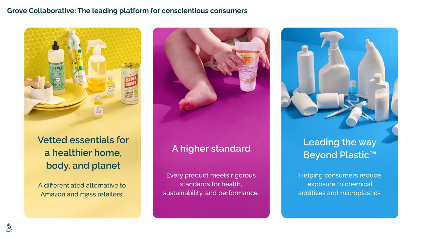 Grove Collaborative: The leading platform for conscientious consumers A differentiated alternative to Amazon and mass retailers. Helping consumers reduce exposure to chemical additives and microplastics. Every product meets rigorous standards for health, sustainability, and performance. Leading the way Beyond Plastic™A higher standard Vetted essentials for a healthier home, body, and planet