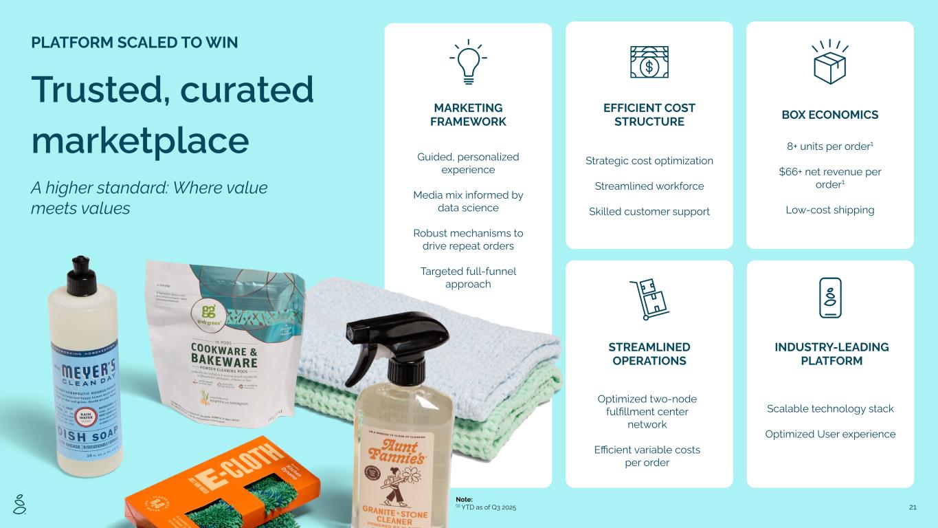 Owned brands strategy evolution Building our portfolio of exclusive products CORE CLEANING: REFILLABLES AND CONCENTRATES EVOLUTION IN THE HOME: PAPER, TRASH, DURABLES Industry leading sustainability: meeting and exceeding eco-conscious expectations Seasonal scents create excitement New formats allowing for broader reach to customers Bamboo based paper enabling unique market offering Frequently used items drive subscriptions Engaging marketing content for customer acquisition MARGIN ACCRETIVE EXPANSION High margins enabling competitive pricing Wellness assortment driving into next generation category GROW PRODUCT MIX