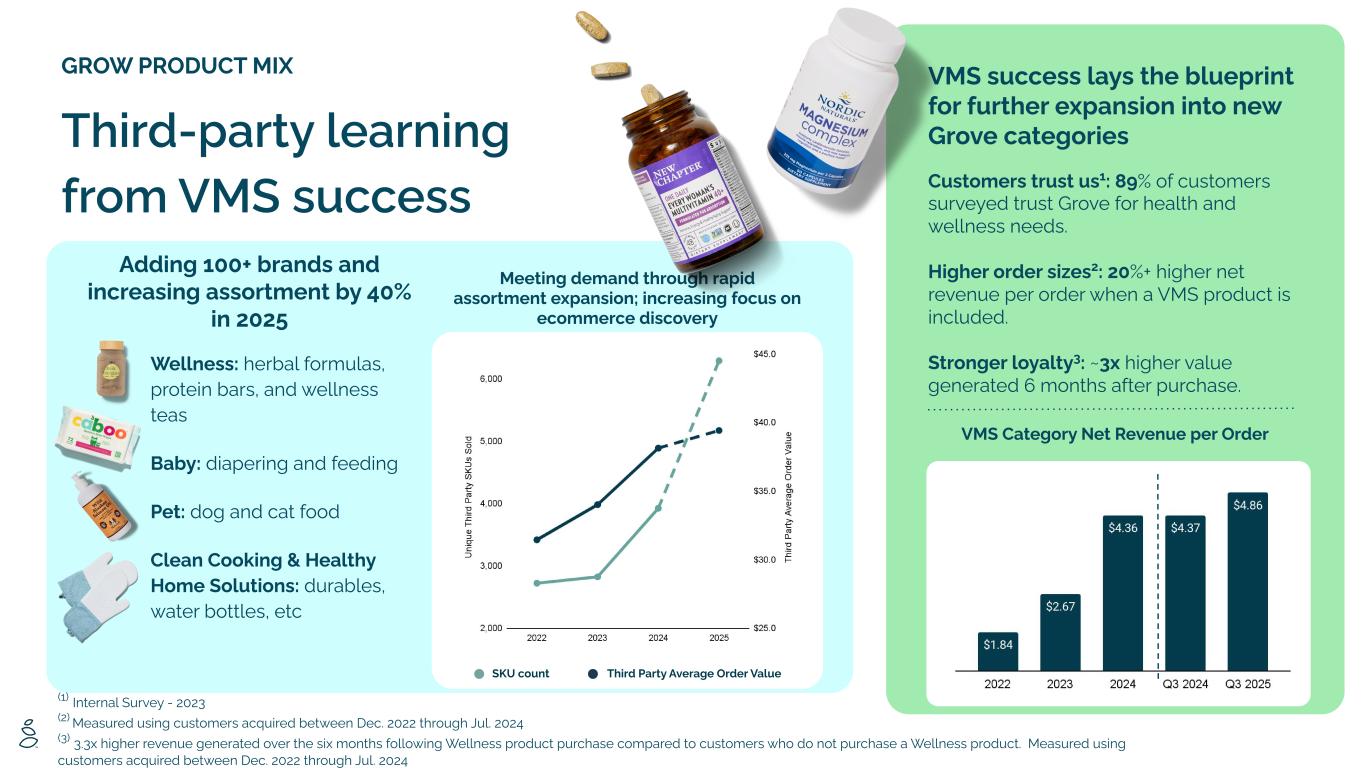 GROW PRODUCT MIX Third-party learning from VMS success VMS success lays the blueprint for further expansion into new Grove categories Customers trust us1: 89% of customers surveyed trust Grove for health and wellness needs. Higher order sizes2: 20%+ higher net revenue per order when a VMS product is included. Stronger loyalty3: ~3x higher value generated 6 months after purchase. Wellness: herbal formulas, protein bars, and wellness teas Baby: diapering and feeding Pet: dog and cat food Clean Cooking & Healthy Home Solutions: durables, water bottles, etc VMS Category Net Revenue per Order Meeting demand through rapid assortment expansion; increasing focus on ecommerce discovery Adding 100+ brands and increasing assortment by 40% in 2025 Third Party Average Order ValueSKU count (1) Internal Survey - 2023 (2) Measured using customers acquired between Dec. 2022 through Jul. 2024 (3) 3.3x higher revenue generated over the six months following Wellness product purchase compared to customers who do not purchase a Wellness product. Measured using customers acquired between Dec. 2022 through Jul. 2024
