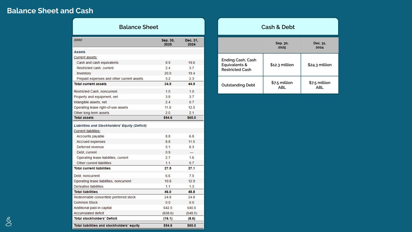 Balance Sheet and Cash Balance Sheet Sep. 30, 2025 Dec. 31, 2024 Ending Cash, Cash Equivalents & Restricted Cash $12.3 million $24.3 million Outstanding Debt $7.5 million ABL $7.5 million ABL Cash & Debt