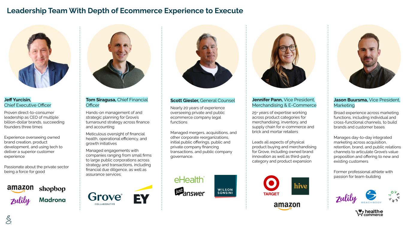 Leadership Team With Depth of Ecommerce Experience to Execute Tom Siragusa, Chief Financial Officer Hands-on management of and strategic planning for Grove’s turnaround strategy across finance and accounting Meticulous oversight of financial health, operational efficiency, and growth initiatives Managed engagements with companies ranging from small firms to large public corporations across strategy and transactions, including financial due diligence, as well as assurance services. Jennifer Pann, Vice President, Merchandising & E-Commerce 25+ years of expertise working across product categories for merchandising, inventory, and supply chain for e-commerce and brick and mortar retailers Leads all aspects of physical product buying and merchandising for Grove, including owned brand innovation as well as third-party category and product expansion Scott Giesler, General Counsel Nearly 20 years of experience overseeing private and public ecommerce company legal functions Managed mergers, acquisitions, and other corporate reorganizations, initial public offerings, public and private company financing transactions, and public company governance. Jason Buursma, Vice President, Marketing Broad experience across marketing functions, including individual and cross-functional channels, to build brands and customer bases Manages day-to-day integrated marketing across acquisition, retention, brand, and public relations channels to articulate Grove’s value proposition and offering to new and existing customers Former professional athlete with passion for team-building Jeff Yurcisin, Chief Executive Officer Proven direct-to-consumer leadership as CEO of multiple billion-dollar brands, succeeding founders three times Experience overseeing owned brand creation, product development, and using tech to deliver a superior customer experience Passionate about the private sector being a force for good